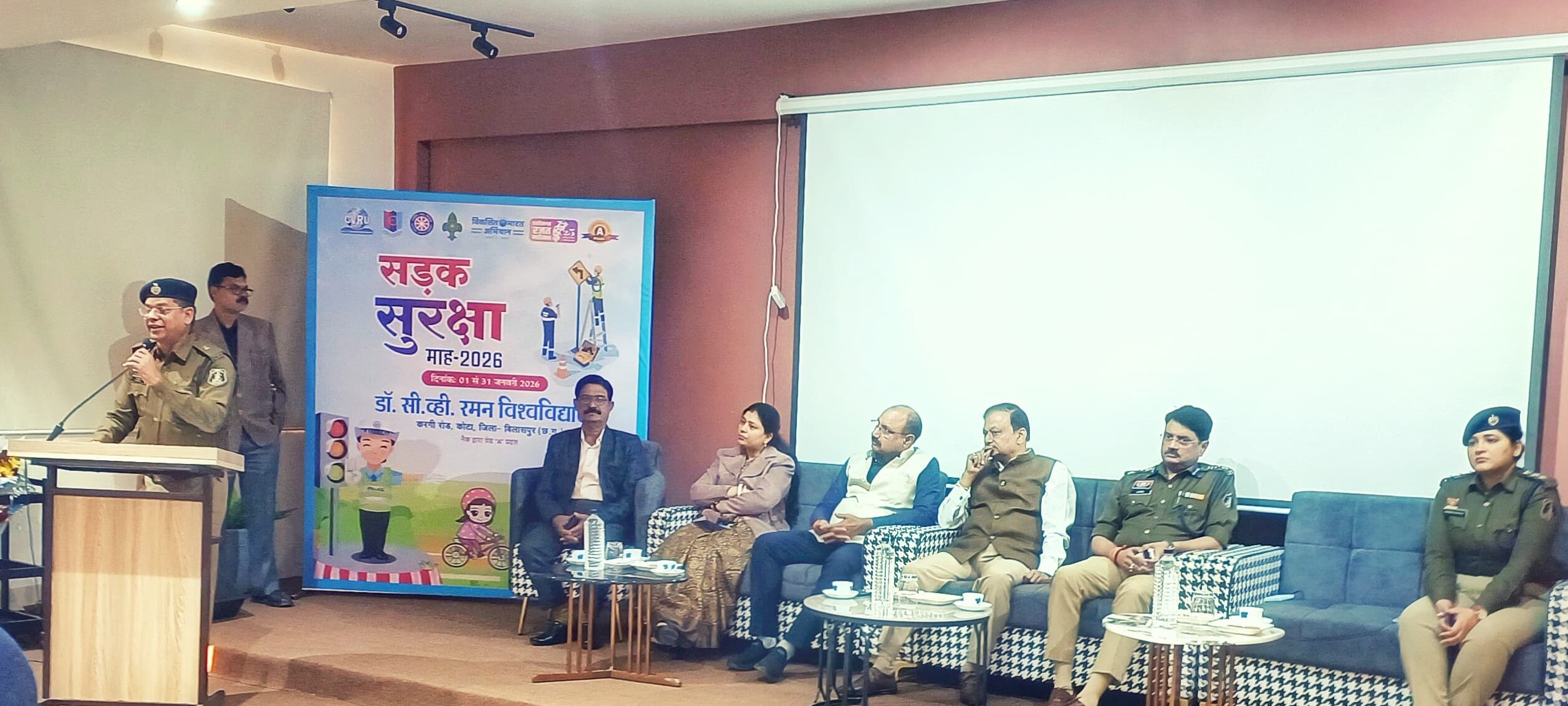 बिलासपुर छत्तीसगढ़ - भूतल एवं सड़क परिवहन मंत्रालय भारत सरकार के द्वारा सड़कों पर वाहन चालकों में यातायात नियमों के प्रति व्यापक जानकारी विकसित करने हेतु राष्ट्रीय स्तर पर राष्ट्रीय सड़क सुरक्षा माह का आयोजन किया जा रहा है इसी क्रम में पुलिस मुख्यालय के दिशा निर्देश पर राज्य के प्रत्येक जिलों में राष्ट्रीय सड़क सुरक्षा माह 2026 का आयोजन अपने बहु आयामी उद्देश्यों को लेकर संचालित की जा रही है बिलासपुर में आदरणीय पुलिस महानिरीक्षक बिलासपुर रेंज संजीव शुक्ला एवं वरिष्ठ पुलिस अधीक्षक रजनेश सिंह के मार्गदर्शन एवं निर्देशन में अतिरिक्त पुलिस अधीक्षक रामगोपाल करियारे के पर्यवेक्षण में नियमित रूप से विभिन्न कार्यक्रमों के माध्यम से आम नागरिकों को सड़क सुरक्षा एवं यातायात नियमों के प्रति जागरूकता प्रदान की जा रही है। इसी क्रम में आज रमन विश्वविद्यालय कोटा बिलासपुर में सड़क सुरक्षा माह 2026 के अनुक्रम में सड़क सुरक्षा जागरूकता कार्यक्रम का आयोजन किया गया जिसमें कुलपति डॉ प्रदीप कुमार घोष, कुल सचिव डॉ अरविंद कुमार तिवारी, समकुलपति डॉ जयति चटर्जी के गरिमामयी उपस्थिति में मुख्य अतिथि के तौर पर वरिष्ठ पुलिस अधीक्षक रजनेश सिंह ने सड़क सुरक्षा पर 4 E (4 ई) के बारे में विस्तृत जानकारियां प्रदान किये। जिसके तहत इंजीनियरिंग, एजुकेशन, एनफोर्समेंट एवं इमरजेंसी स्वास्थ्य सर्विस को विस्तार से समझाते हुए विश्वविद्यालय परिसर में छात्र-छात्राओं को यातायात बिलासपुर में इंजीनियरिंग सुधार के परिणाम स्वरूप दुर्घटना जन्य 6 ब्लैक स्पॉट में सड़क दुर्घटनाओं के आंकड़ों में आई कमी के बारे में जानकारी दिए और साथ ही यह भी बताया की यातायात पुलिस बिलासपुर के द्वारा विभिन्न विभागों से समन्वय कर की गई इंजीनियरिंग समाधान कारक सुधार एवं प्रयास के परिणाम स्वरूप अत्यधिक दुर्घटना जन क्षेत्र अर्थात ब्लैक स्पॉट की संख्या में 50% की कमी आई है। अर्थात 6 में से तीन ब्लैक स्पॉट को इंजीनियरिंग सुधार एवं लगातार जागरूकता एवं इंफोर्समेंट की कार्यवाही के माध्यम से ब्लैक स्पॉट के पैमाने से हटाए गए है। उन्होंने बताया कि बिलासपुर में पिछले वर्ष की तुलना में इस वर्ष सड़क दुर्घटनाओं में वाहन चालकों की मृत्यु के आंकड़ों में 20% की कमी परिलक्षित हुई है जिसके लिए यातायात पुलिस बिलासपुर की कठोर, सख्त एवं प्रभावी कार्यवाही एवं आम नागरिकों के जन सहयोग से विभिन्न कार्यक्रमों के माध्यम से लगातार जन-जन में यातायात नियमों के प्रति संवेदनशीलता एवं अनुशासन विकसित कर लोगों को अनुशासित आवागमन हेतु प्रेरित करने का परिणाम है।